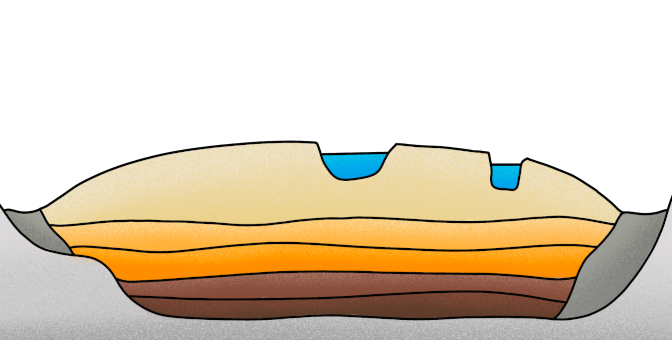 ein Teich wächst langsam zu, Schlamm sammelt sich an, die Wassertiefe nimmt ab, die Wasserfläche wird immer kleiner bis sie ganz verschwindet