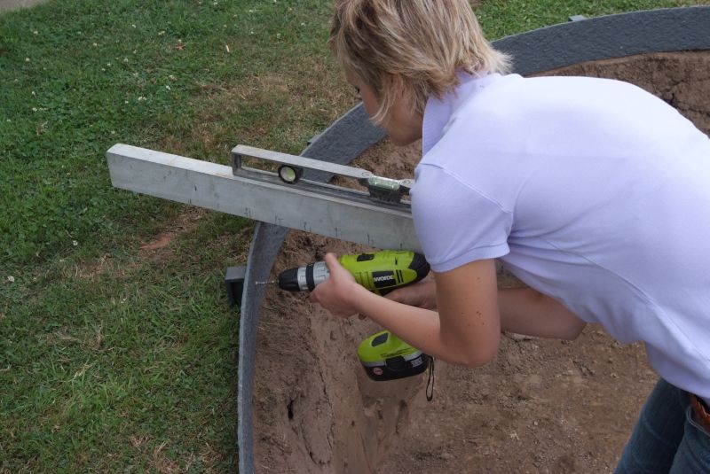 Nun wird das Profilband vom Teichrandsystem an den Pfählen verschraubt. Dabei wird die Oberkante des Bandes mit einer Wasserwaage / Laser ausgerichtet. Im nächsten Schritt werden Teichvlies und Folie über das Profilband gelegt und auf der Uferseite mit Erde obder Steinen stabilisiert.